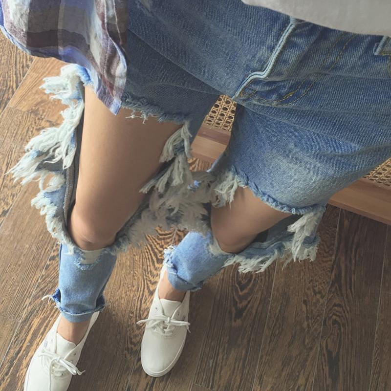 Start a sexy new trend with these big hole boyfriend jeans, this long torn design is perfect for denim bling!